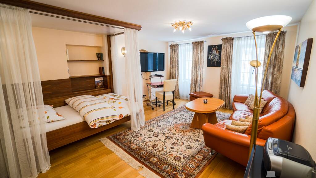 Im Wohn-/Schlafraum finden Sie eine gemütliche Couch, ein Einzelbett, einen kleinen Schreibtisch, TV, DVD Player und Radio. Natürlich haben Sie im Apartment auch WLAN.