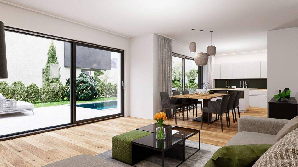 Die Bauweise entspricht dem Klimahaus A nature Standard und umfasst technische Lösungen wie Wärmepumpe zum Heizen und Kühlen mit Bodenheizung, dezentrale Wohnraumlüftung mit Wärmerückgewinnung, Photovoltaik sowie Holz Alu Fenster mit Dreifachverglasung. Hochwertige Materialien, klare Linien und ein stimmiges Raumkonzept schaffen ein Wohnumfeld, in dem Komfort und Gestaltung eine harmonische Einheit bilden.