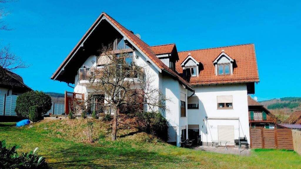 Wir bieten ein sehr gepflegtes Dreifamilienhaus mit 2 Garagen und mehreren Pkw-Stellplätzen zum Verkauf an. Das Wohnhaus teilt sich wie folgt auf: Über den Hauseingang betritt man ebenerdig das Untergeschoss, das eine Dreizimmerwohnung beinhaltet mit Terrasse und Zugang zum Garten. Diese Wohnung hat 95,7 m² Wohnfläche. Auf dieser Etage befinden sich außerdem die Kellerräume, ein Wasch- und Trockenraum und der Heizungsraum mit Öllager. In der mittleren Etage liegt eine 5-Zimmer-Wohnung mit 141,1 m² Wohnfläche, die nach hinten über die Terrasse ebenfalls einen ebenen Zugang zum Garten hat. Im DG befindet sich ebenfalls eine 5-Zimmer-Wohnung mit Westbalkon und 127,2 m² Wohnfläche. Auf dem Niveau der mittleren Wohnung befindet sich ein von außen zugänglicher Abstellbereich über den Garagen. Alle drei Wohnungen sind vermietet zu einer jährlichen Kaltmiete von insgesamt EUR 30.120,--.