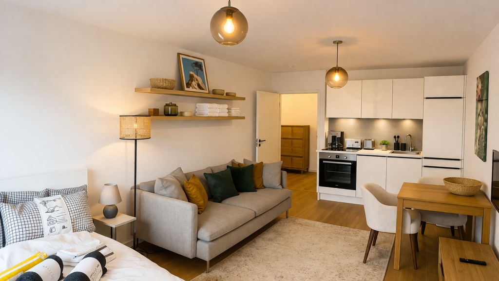 This high-quality, fully furnished studio apartment impresses with a well-thought-out layout and modern interior design.