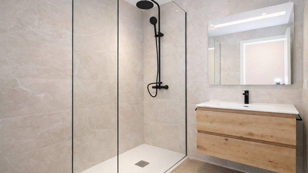 Das hochwertige Badezimmer wurde mit viel Liebe zum Detail gestaltet. Eine bodengleiche Dusche, sowie eine warme Ambientebeleuchtung schaffen ein stilvolles Ambiente.