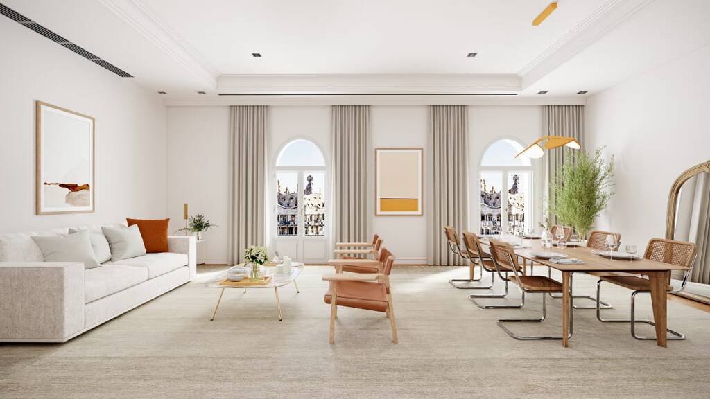 The apartment is divided into two areas, the first facing the Paseo de Gracia consists of a hall from which you access the kitchen and a majestic living room with access to a balcony with northeast orientation. The rear area consists of 2 double bedrooms, both in suite with a full bathroom and an extra courtesy bathroom.
