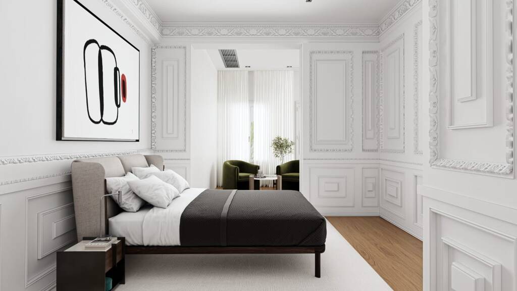 The carpentry and hardware of the doors stand out for their solidity and for the moldings that decorate them, giving them a classic and robust appearance. The wooden plinths are higher than usual, following the detail of the contour of the doors and favoring the integrity of the whole, with hermetic and soft closures at the same time.