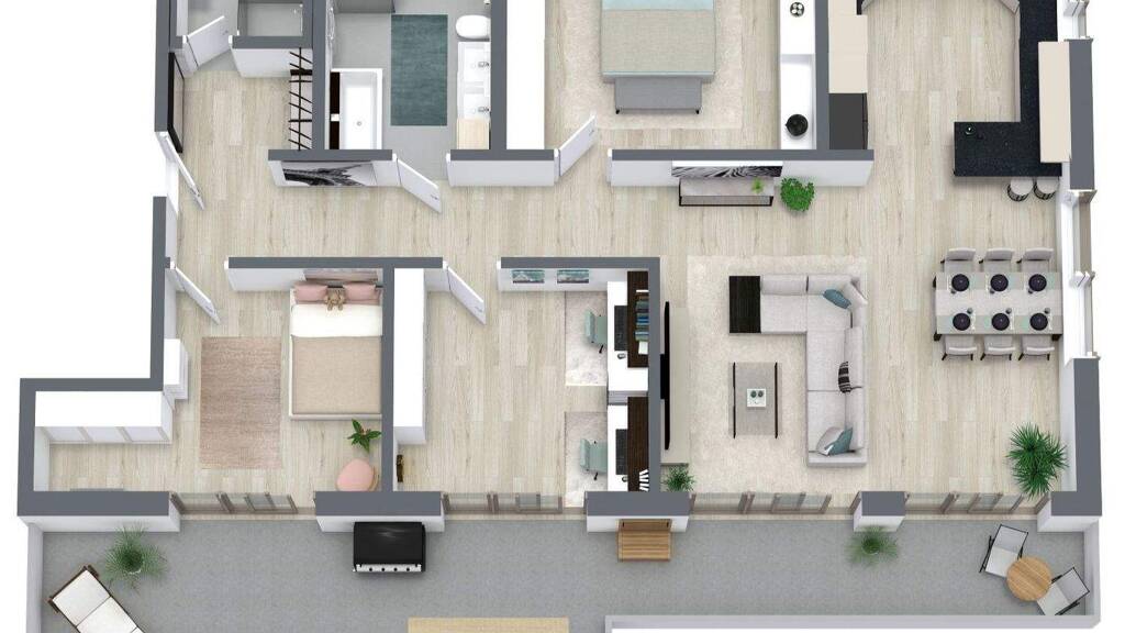 Das Herzstück der Wohnung bildet der großzügige, offen gestaltete Wohn- und Essbereich inklusive Küche (ca. 44 m²), der sich nahtlos zur Süd-Dachterrasse (ca. 37 m²) öffnet. Hier genießen Sie ganztägig Sonne, Ruhe und einen freien Blick ins Grüne - ideal für entspannte Stunden im Freien. Das Schlafzimmer (ca. 15 m²) sowie zwei weitere Zimmer mit ca. 16 m² und ca. 13 m² bieten flexible Nutzungsmöglichkeiten, etwa als Kinder-, Arbeits- oder Gästezimmer. Die Eingangsdiele mit integrierter Abstellnische und Dachflächenfenster sorgt für zusätzlichen Stauraum und eine klare, harmonische Raumstruktur. Das lichtdurchflutete Tageslichtbad (ca. 9 m²) ist mit einer Badewanne, Dusche, modernen Sanitärelementen und großformatigen Fliesen ausgestattet. Für zusätzlichen Komfort steht ein separates WC/Duschbad (ca. 3,5 m²) mit bodengleicher Dusche, Glasduschkabine und elektrischem Handtuchheizkörper zur Verfügung.
