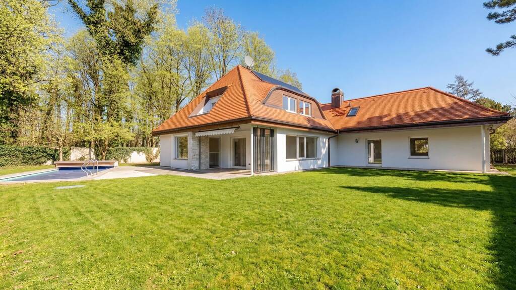 Als wunderbares Outdoor-Refugium zeigt sich der idyllische Garten, der das Haus umgibt. Weitläufige Rasenflächen laden zum Spielen und Toben, auf den sonnigen Terrassenflächen lässt es sich mit Blick ins Grüne herrlich entspannen. Ein Pool macht dieses familienfreundliche Domizil in ruhiger und grüner Lage perfekt.