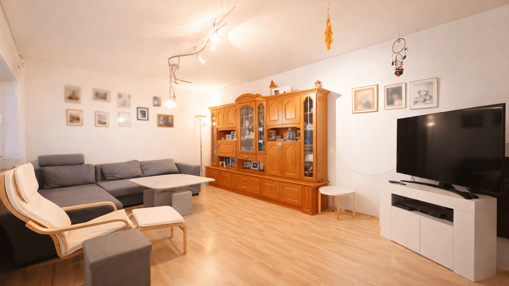 Das großzügige Wohnzimmer bildet den zentralen Wohnbereich und bietet ausreichend Platz für Wohnen und Essen. Zwei gut geschnittene Schlafzimmer ermöglichen eine flexible Nutzung - ideal für Familien, Paare oder als Kombination aus Schlaf-, Arbeits- und Gästezimmer. Die moderne Einbauküche ist mit hochwertigen Elektrogeräten ausgestattet und bietet viel Stauraum.