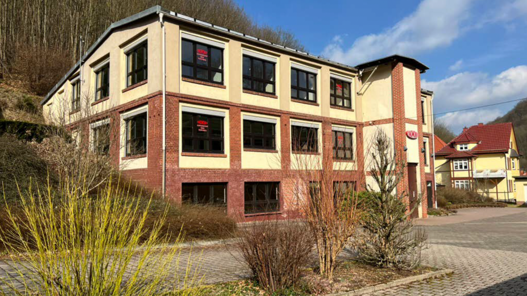Zum Verkauf steht ein vielseitig nutzbares Immobilienensemble in 99842 Ruhla. Das Objekt besteht aus einem großzügigen, leerstehenden Bürogebäude, einem kernsanierten Einfamilienhaus, einem Werkstatt- und Garagenkomplex sowie großzügigen Parkflächen – alles auf einem Grundstück mit über 3.100 m² Fläche.