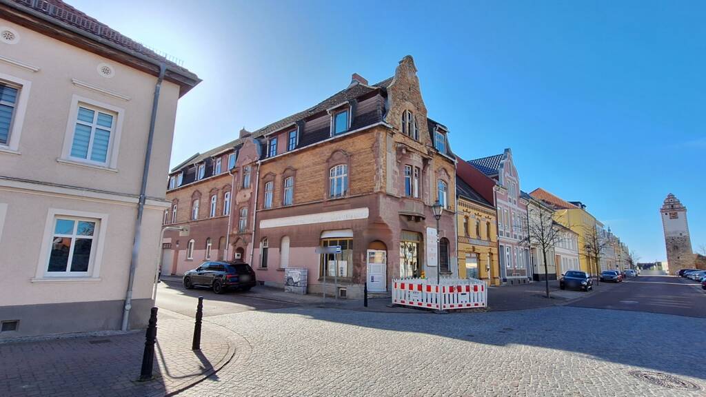 Das als Baudenkmal ausgewiesene Wohn- und Geschäftshaus wurde um 1900 gebaut und befindet sich mitten in der Innenstadt von Aken. Es wurde vom jetzigen Eigentümer teilsaniert. Die Immobilie verfügt über ein Ladengeschäft und fünf Wohneinheiten, wovon zwei Wohneinheiten zur Vermietung geringfügig modernisiert werden müssen und drei Wohneinheiten eine umfangreiche Sanierung bedürfen. Im Erdgeschoss, welches mit einem Verkaufsraum und zwei Nebenräumen ausgestattet ist, liegt das Ladengeschäft, dass derzeit als Büro genutzt wird. Oberhalb dessen liegen im 1. OG und im 2. OG jeweils eine Dreizimmerwohnung. Auf der linken Seite des Hauses sind die drei Zweizimmerwohnungen im EG, 1.OG und 2.OG gelegen. Das Gebäude wird über eine Gaszentralheizung mit Brennwerttechnik beheizt. Links in der Immobilie ist die Garage, welche gleichzeitig den Zugang zum Hofgebäude, einer ehemaligen Schmiede, darstellt.