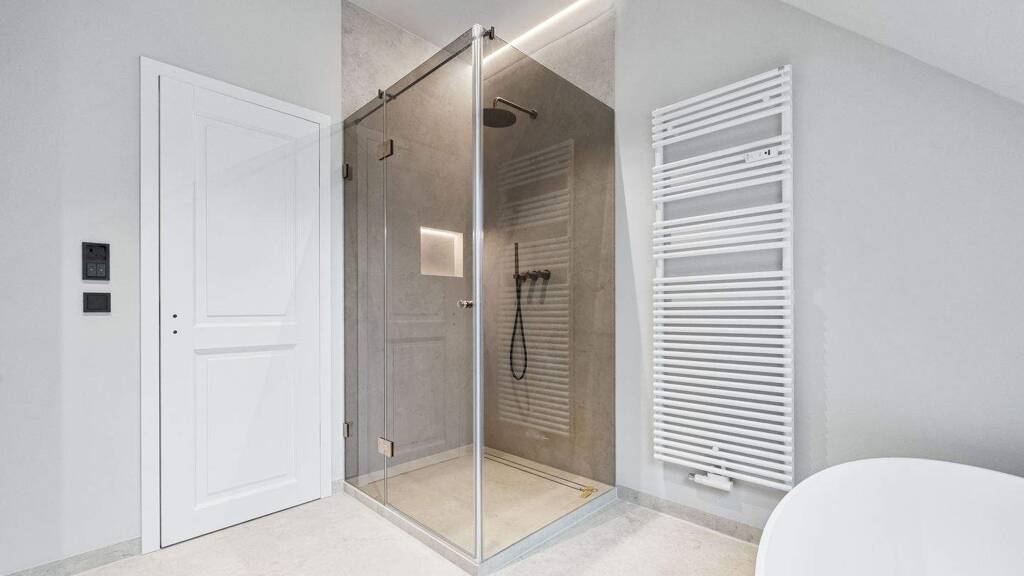 Das Herzstück der Wohnung bildet die offen gestaltete Wohnküche, die sich nahtlos in den Wohnbereich einfügt und Raum für eine individuelle Küchengestaltung bietet. Auf beiden Ebenen steht jeweils ein hochwertig ausgestattetes Badezimmer zur Verfügung. Diese überzeugen durch ein modernes Design mit Bronze Armaturen von Gessi, großformatigen Feinsteinzeugfliesen, grau getönten Glas-Duschabtrennungen sowie beleuchteten Wandnischen in den Duschen. Handgefertigte, geflieste Waschtische, im Masterbad als Doppelwaschtisch, mit maßgefertigten Unterbauschränken vom Tischler sowie eine integrierte Lichtvoute im Duschbereich unterstreichen den hohen Ausstattungsanspruch. Die dem Masterbad zugeordnete Toilette befindet sich in einem separaten Raum und sorgt für zusätzlichen Komfort.