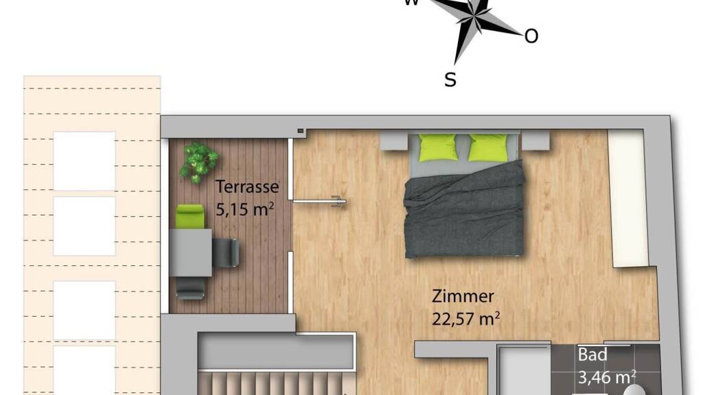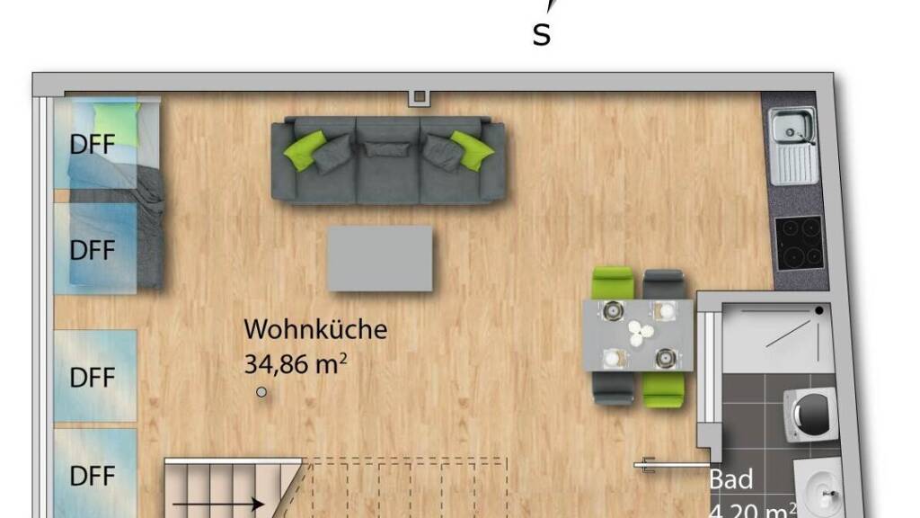 Top 9 verfügt über eine Wohnfläche von rund 60m² und verteilt sich auf zwei Ebenen. Die erste Ebene befindet sich im 2. OG und erreichen Sie bequem mit dem Lift.