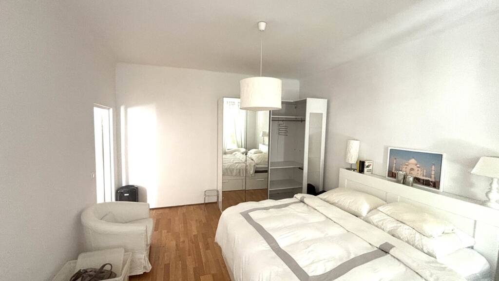 Das Schlafzimmer ist ein ruhiger Rückzugsort, der Ihnen erholsame Nächte garantiert. Es bietet genügend Platz für einen großen Kleiderschrank und sorgt für eine angenehme Wohnatmosphäre. Das Badezimmer ist mit einer Dusche, einem Waschbecken und einem Waschmaschinenanschluss ausgestattet.