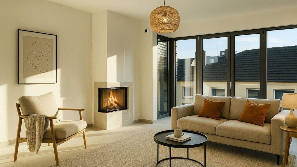 Der offene Wohn-, Ess- und Kochbereich mit Gaskamin, bodentiefen Fenstern und Fußbodenheizung schafft ein helles, einladendes Ambiente. Zwei großzügige Schlafzimmer, ein hochwertiges Bad mit Wanne und bodentiefer Dusche sowie ein separates Gäste-WC bieten hohen Wohnkomfort für Singles, Paare oder kleine Familien.