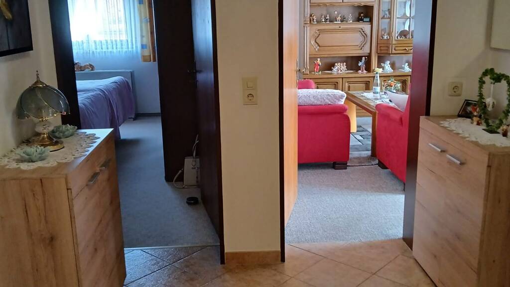 Die zweite Wohnung befindet sich im 1. Obergeschoss und ist abgeschlossen. Aufgeteilt ist sie in Kinderzimmer, WC separat, Badezimmer, Schlafzimmer, Küche mit Einbauküche, Wohnzimmer mit Zugang zum Balkon. Die Wohnung hat ca. 85 m² Wohnfläche.