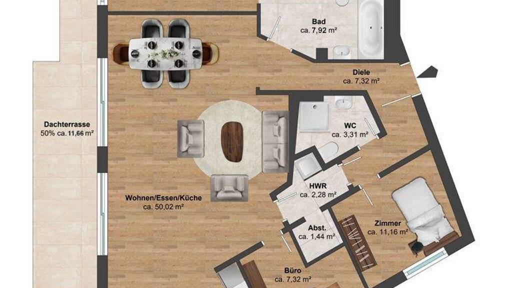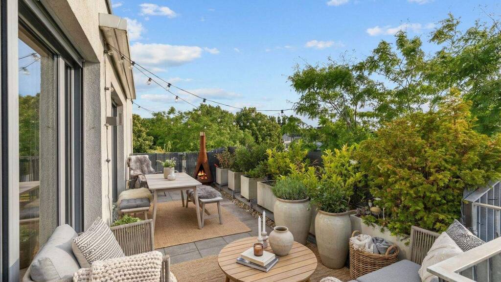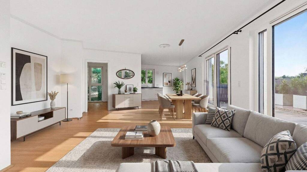 Das lichtdurchflutete Penthouse befindet sich im Staffelgeschoss einer modernen, gepflegten und aus 31 Wohneinheiten bestehenden viergeschossigen Wohnanlage. Das im Jahre 2017 fertiggestellte Wohnensemble überzeugt durch die attraktive Terrassenarchitektur, den hervorragenden Energiewert und den Fahrstuhl von der Tiefgarage - dies ermöglicht einen barrierefreien Zugang zur Wohnung. Mit einer großzügigen Fläche von ca. 120 m² bietet das Penthouse auf vier optimal aufgeteilten Zimmern höchsten Wohnkomfort und eine durchdachte Raumgestaltung. Die Wohnung beeindruckt durch ihre hochwertige Ausstattung: vom eleganten Eichen-Parkettboden, dreifach verglasten bodentiefen Fenstern, Lüftungsanlage in einigen Räumen, elektrischen Außenrollläden, einer elektrischen Markise, Fußbodenheizung und Video-Gegensprechanlage. Der lichtdurchflutete Wohn-/Essbereich mit angeschlossener offener Einbauküche ist großzügig gestaltet (ca. 50 m²) und bietet ausreichend Platz für eine gemütliche Sitzecke und einen großen Essbereich. Zu den absoluten Highlights dieser Wohnung zählen zum einen die sonnige Süd/West-Dachterrasse mit einer Fläche von ca. 25 m², welche über eine leicht begehbare Stufe zugänglich ist und zum anderen das Hauptschlafzimmer mit Ankleidezimmer und dem Bad en suite. Die Wohnung bietet durch ihre flexible und durchdachte Raumaufteilung einen separaten Bereich mit 2 Zimmern für Büro, Gäste- oder Kinderzimmer (diese können bei Bedarf, ohne großen Aufwand, zu einem ca. 19 m² großen Zimmer umgestaltet werden), Gäste WC mit bodentiefer Dusche, Abstellraum und Platz für eine Waschmaschine - ideal für Ihre individuellen Bedürfnisse. Die helle Einbauküche mit dezent glänzenden Fronten, den hochwertigen E-Geräten von Siemens und der Granitarbeitsplatte fügt sich nahtlos in das offene Raumkonzept ein. Ein Kellerraum und ein gemeinschaftlicher Fahrradraum stehen Ihnen ebenso zur Verfügung. Ein behindertengerechter Tiefgaragen-Stellplatz kann optional für 30.000 € erworben werden. Überzeugen Sie sich selbst vor Ort von den Vorteilen dieses tollen Penthouses und vereinbaren Sie noch heute einen Besichtigungstermin - wir freuen uns auf Ihre Nachricht.