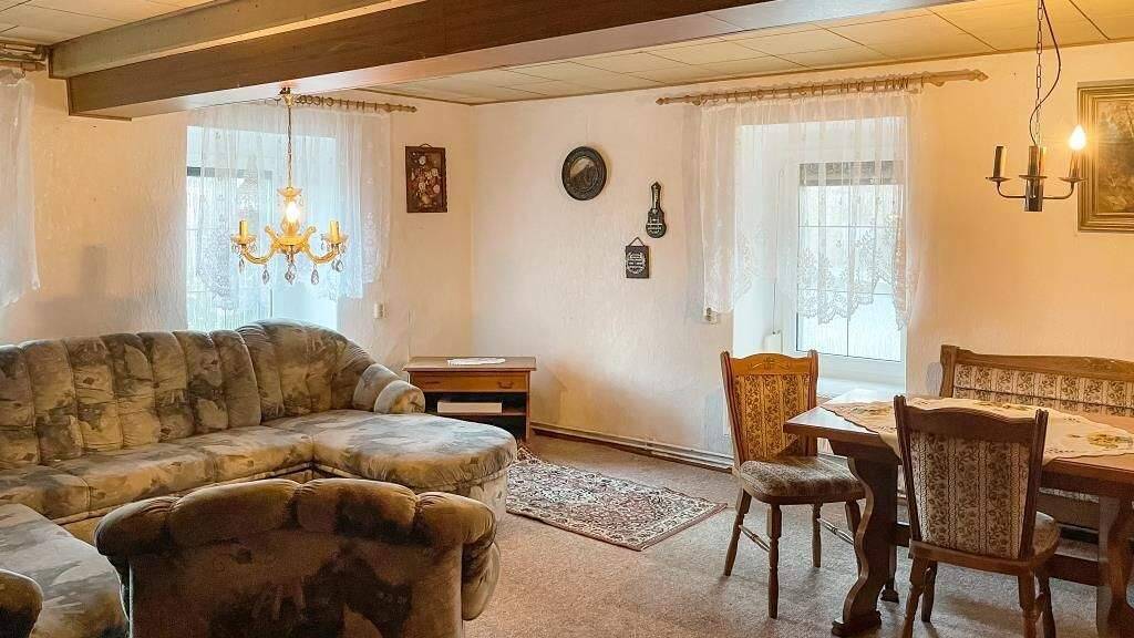 Bereits beim Betreten des Hauses empfängt Sie ein zentraler Flur, von dem aus die Räume gut erschlossen sind. Herzstück im Erdgeschoss ist das geräumige Wohnzimmer mit Kachelofen, das eine behagliche Atmosphäre schafft. Eine Wohnküche mit Sitzecke bildet den praktischen Mittelpunkt des Alltags; angrenzend befindet sich ein weiterer Raum, der zusätzlichen Arbeits- und Küchenbereich bietet.