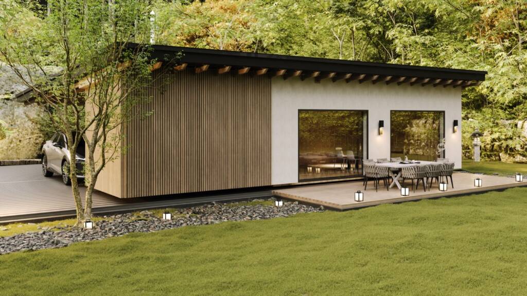 Dieser kompakte Bungalow weist eine Fläche von 70 + 10 m2 (also 80m2 mit Abstellraum) auf, wird in hochwertiger ökologischer Holzbauweise errichtet und besticht durch seine umfangreiche Ausstattung. Parallel zur einzelraumgesteuerten Infrarotheizung versorgt ein Kaminofen das Haus mit wohliger Wärme.