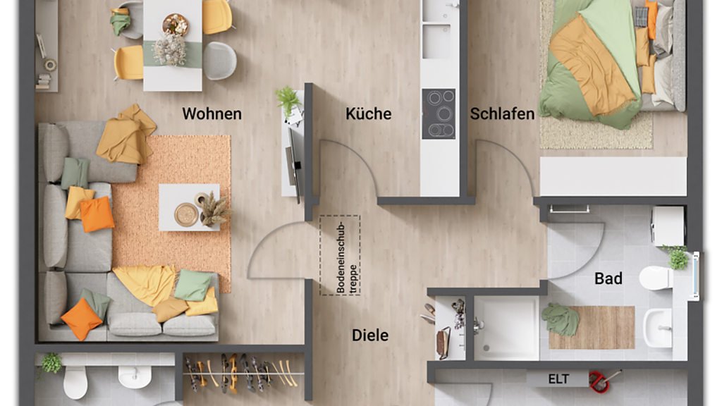 Der Bungalow 78 bietet Ihnen alles, was Sie sich für Ihr zukünftiges Zuhause wünschen können: großzügige Räume, durchdachte Details und hochwertige Materialien, die für eine wohnliche und einladende Atmosphäre sorgen. Der Bungalow besticht durch seine klare und funktionale Aufteilung. Hier ist jedes Zimmer so gestaltet, dass es Ihnen maximalen Komfort und Raum zum Wohlfühlen bietet.