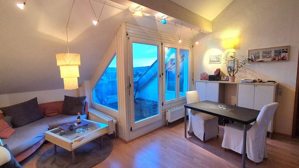 Highlights: - Guter Schnitt mit groĂźem Wohn- und Essbereich - Tageslichtbad mit Wanne, WC und Anschluss Waschmaschine - Dachterrasse mit Ausblick - Kellerraum im Untergeschoss - Tiefgaragenplatz in der Tiefgarage