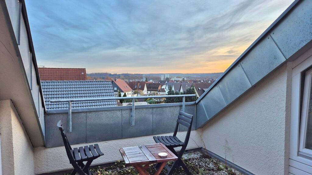 Der Dielenbereich bietet Platz für kleine Garderobe und Schuhschrank. Herzstück der Wohnung ist der offene Wohn- und Essbereich, welcher durch die großen Fensterflächen sehr hell gestaltet ist. Von hier aus gelangt man bequem auf die kleine Dachterrasse, welche einen schönen Blick über die Dächer Schönaichs bietet und zum Entspannen einlädt.