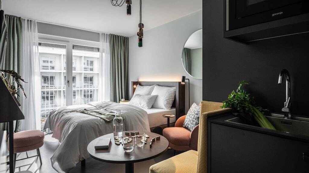 Hier steht das Wohlfühlen und länger bleiben im Mittelpunkt. Retro-Sessel und -Accessoires wechseln sich mit modernen Designermöbeln ab. Eine voll ausgestattete Kitchenette sorgt dafür, dass es Ihnen an nichts fehlt.