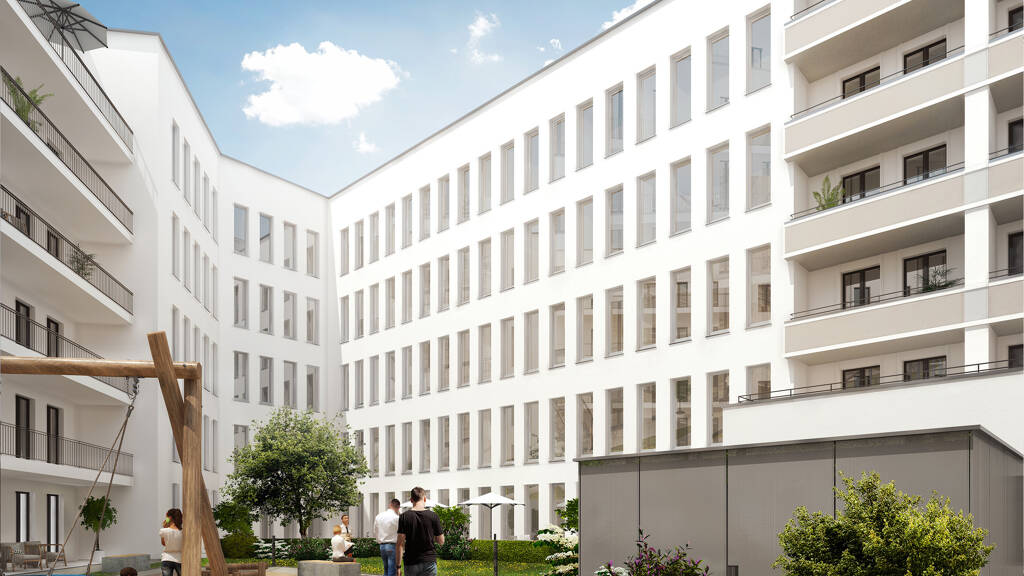 Der Innenbereich des Neubaus wird mit einem Spielplatz und charmanten Sitzgelegenheiten zu einer innerstädtischen Ruheinsel gestaltet. Zahlreiche Abstellmöglichkeiten für Fahrräder stehen sowohl im Innenhof als auch in der Tiefgarage zur Verfügung.