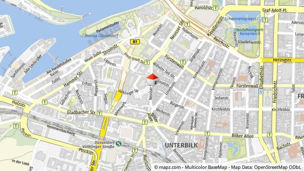 Das Mehrfamilienhaus liegt im Stadtteil Unterbilk, der rechtsrheinisch zwischen dem Hafen und der Friedrichstraße liegt um zum Stadtbezirk 3 gehört. Der Stadtteil zählt zu den kleineren Stadtteilen der Landeshauptstadt, hat aber die zweithöchste Bevölkerungsdichte direkt nach Friedrichstadt. Ein Mix aus historischen Altbauten, modernen Neubauprojekten und stilvollen Loftwohnungen zeichnen das Umfeld aus. Die beliebte Lorettostraße befindet sich in unmittelbarer Nähe und bietet durch gemütliche Cafés und Restaurants sowie diverse kleine Geschäfte einen besonderen Charme. Der bekannte Medienhafen ist fußläufig zu erreichen. Das Zentrum von Düsseldorf mit seiner berühmten Königsallee und seinen exklusiven Einkaufsmöglichkeiten ist von hier ebenso gut zu erreichen wie die Düsseldorfer Altstadt. Die Nahverkehrsanbindung ist mit zahlreichen Bus- und Straßenbahnlinien als sehr gut zu bezeichnen. Der Anschluss an das Autobahnnetz mit seinen Autobahnen A46, A52 und A57 ist ebenfalls nahezu perfekt. Bis zum Flughafen Düsseldorf benötigt man mit dem Auto rund 25 Minuten, mit dem Nahverkehr ca. 30 Minuten.
