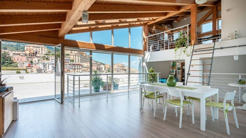 Im zweiten Stock betritt man einen Raum, der sofort durch seine Helligkeit besticht: ein großer Wohnbereich mit Kochnische, der durch Fensterfronten gekennzeichnet ist, die den Raum mit Licht durchfluten und dank des kleinen Innenhofs auch die darunter liegenden Stockwerke mit Tageslicht versorgen. Ein Zwischengeschoss beherbergt den Technikraum, während der eigentliche Protagonist die große Terrasse ist, von der aus sich der Blick auf die Äolischen Inseln, das Blau des Tyrrhenischen Meeres und die eindrucksvolle Kathedrale von Patti öffnet und einzigartige Ausblicke bietet.