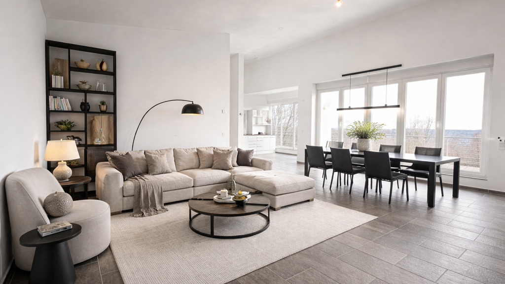 Der weitläufige Wohn-, Ess- und Küchenbereich bildet das Herzstück der Wohnung und wird durch großzügige, bodentiefe Fensterflächen mit Tageslicht durchflutet. Edler italienischer Premium-Bodenbelag verleiht den Räumen eine exklusive, zeitlose Eleganz.