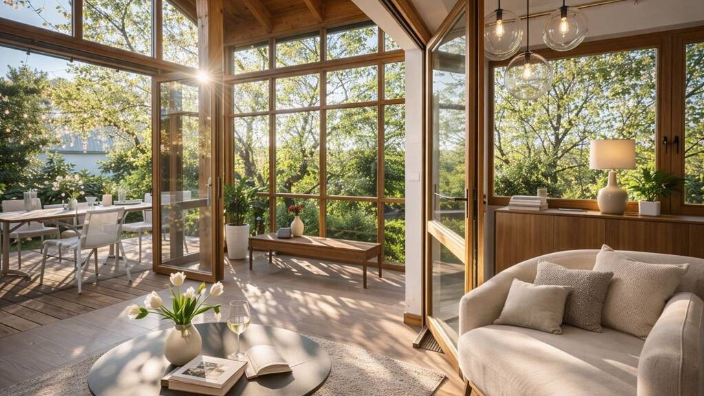 Große Fensterfronten lassen Licht und Natur ins Haus – der Übergang zwischen innen und außen verschwimmt fast.