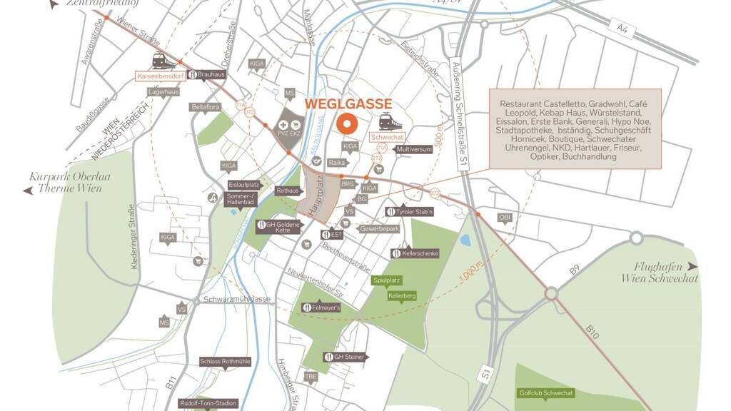 Genießen Sie das Beste aus zwei Welten: die entspannte Atmosphäre einer charmanten Wohngegend und die schnelle Verbindung nach Wien sowie zum Flughafen. Die Schnellbahnstation (13 min nach Wien Mitte-Landstraße), Einkaufsmöglichkeiten, Restaurants und viele weitere wichtige Örtlichkeiten des täglichen Bedarfs befinden sich nur einen Katzensprung entfernt.