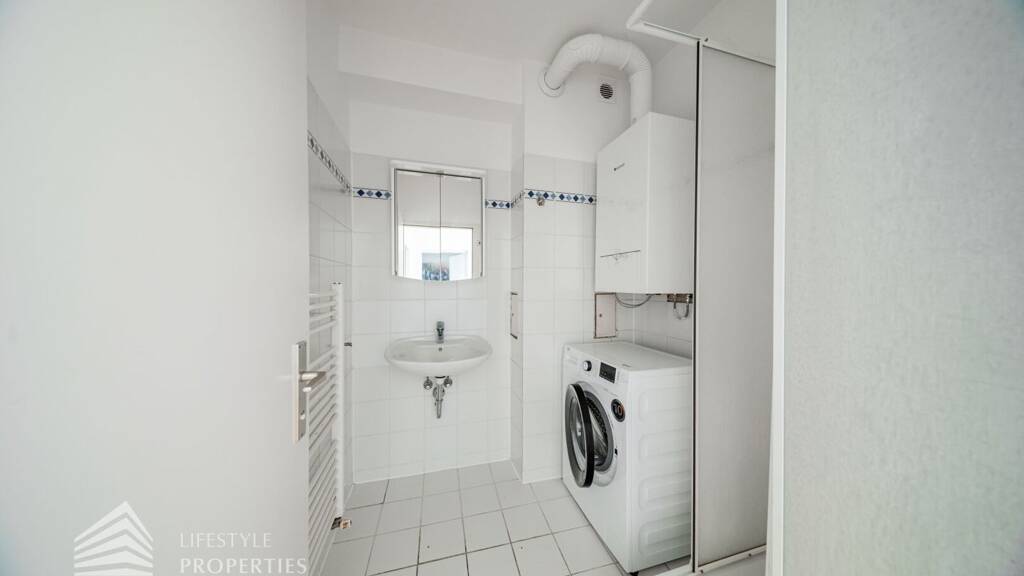 Sie betreten die Wohnung und befinden sich im Vorraum, sowohl das Wohnzimmer als auch das Schlafzimmer sind zentral vom Vorraum begehbar. Das Bad ist mit einer Dusche, einem Handwaschbecken und einem Handtuchtrockner ausgestattet. Die Küche befindet sich links beim Wohnungseingang. Das separate WC ist ebenfalls vom Vorraum erreichbar. Die Wohnräume sind mit schönem Parkett ausgestattet und die Nassräume sind verfliest.