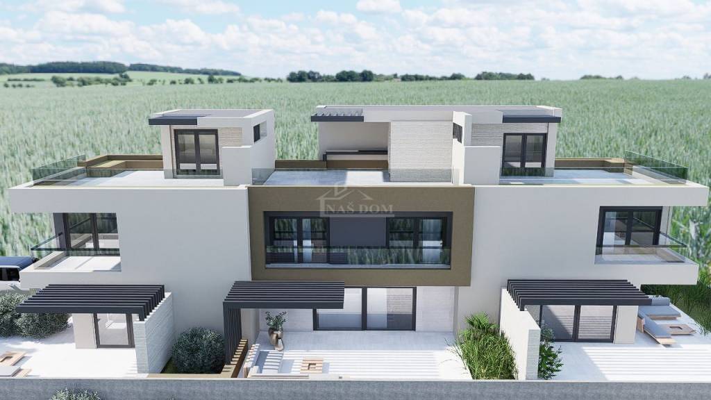 Vodice, SRIMA - Wohnungen mit Pool in einem Neubau in Strandnähe zu verkaufen. Das Projekt mit modernem Design umfasst drei Etagen: Erdgeschoss + Obergeschoss + Dachterrasse und besteht aus drei Wohneinheiten. Jede Einheit verfügt über einen eigenen kleinen Gartenbereich und zwei Parkplätze. Das Projekt wird derzeit mit hochwertigen Materialien gebaut und gemäß den neuesten Baustandards ausgestattet. Die geplante Fertigstellung ist im Sommer 2026.