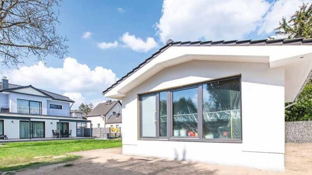 Das Gästehaus im hinteren Bereich des Grundstücks wurde 1961 gebaut und in 2025 vollständig saniert und umgebaut. Es verfügt über ca. 66,9 m² Wohnfläche, die sich auf zwei Ebenen verteilt. Im Hochparterre sind der Wohnbereich mit offener Küche und ein WC untergebracht. Das Souterrain umfasst drei Räume – genutzt als Bad mit bodentiefer Dusche, Schlafzimmer und einem weiterer Wohn-/Freizeitbereich mit abgetrenntem Technikbereich.