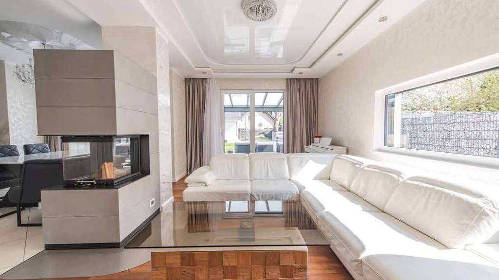Im Obergeschoss befinden sich das Schlafzimmer mit anschließendem Ankleidezimmer, weitere zwei Zimmer mit jeweils etwa 15 m² sowie ein großes, luxuriös ausgestattetes Bad mit Spiegel-TV, Villeroy & Boch Möbeln sowie mit einer vorgerüsteten Sauna. Auf dieser Etage ist außerdem zusätzlicher Platz für ein Büro oder einen Hobbyraum (ca. 9 m²).