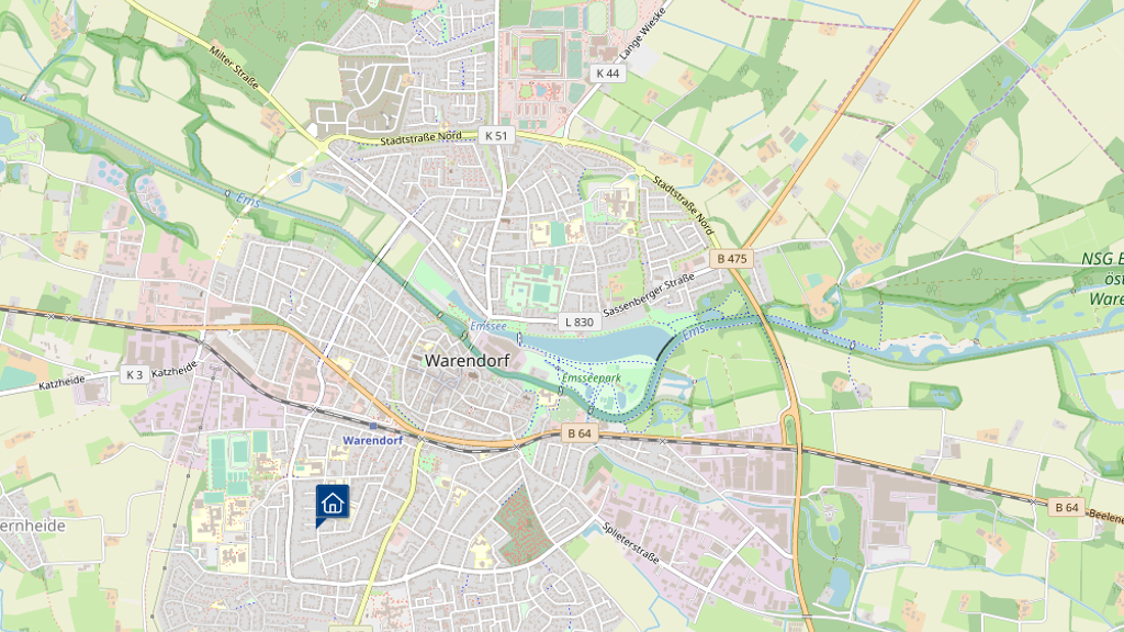 Warendorf (ca. 37.600 Einwohner), bekannt für die Hengstparaden des Nordrhein-Westfälischen Landgestüts, verbindet kleinstädtischen Charme mit hoher Lebensqualität. Das Einfamilienhaus befindet sich ca. 1,2 km südwestlich des Stadtzentrums in ruhiger, familienfreundlicher Lage. Schule und zwei Kindergärten sind fußläufig erreichbar. Ärzte, Zahnarzt sowie mehrere Apotheken befinden sich in der näheren Umgebung. Zahlreiche Freizeitangebote wie Wasserpark, Theater, Museum, Sportanlagen und Fitnessstudio liegen ebenfalls in kurzer Distanz. Naherholungsgebiete wie Zumlohpark, Emsseepark und der Park am alten Bahnhof sind bequem zu Fuß oder mit dem Fahrrad erreichbar. Supermärkte (u. a. PENNY, Lidl), Bäckerei und Drogeriemärkte befinden sich in unmittelbarer Nähe. Die Verkehrsanbindung ist ausgezeichnet: Der Bahnhof Warendorf liegt ca. 700 m entfernt, eine Bushaltestelle befindet sich direkt vor der Haustür; die A2 (Anschluss Vellern) ist in ca. 18 km erreichbar. Insgesamt bietet die Immobilie eine ausgewogene Kombination aus ruhigem Wohnen, familiengerechter Infrastruktur und vielfältigen Freizeitmöglichkeiten.