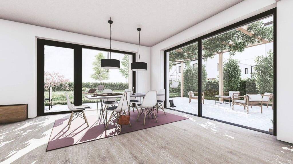 Lichtdurchflutetes Erdgeschoss: Ein offener Wohn- und Essbereich mit integrierter Küche bildet das Herzstück des Hauses . Von hier aus gelangen Sie direkt auf die überdachte Veranda und in Ihren großzügigen Garten .
