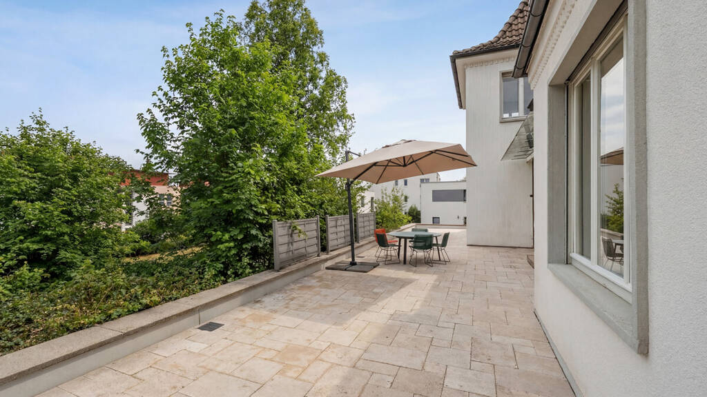 Das repräsentative Erdgeschoss vereint Wohnen und Arbeiten auf großzügiger Fläche. Aktuell befinden sich hier die Küche mit Essbereich, das Wohnzimmer sowie ein separates Home-Office. Große Fensterflächen öffnen den Blick in den gepflegten Garten mit Altbestand sowie die ca. 70 m² große Terrasse.