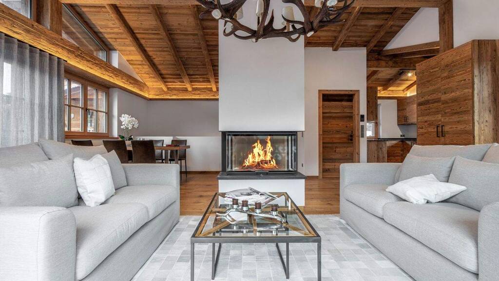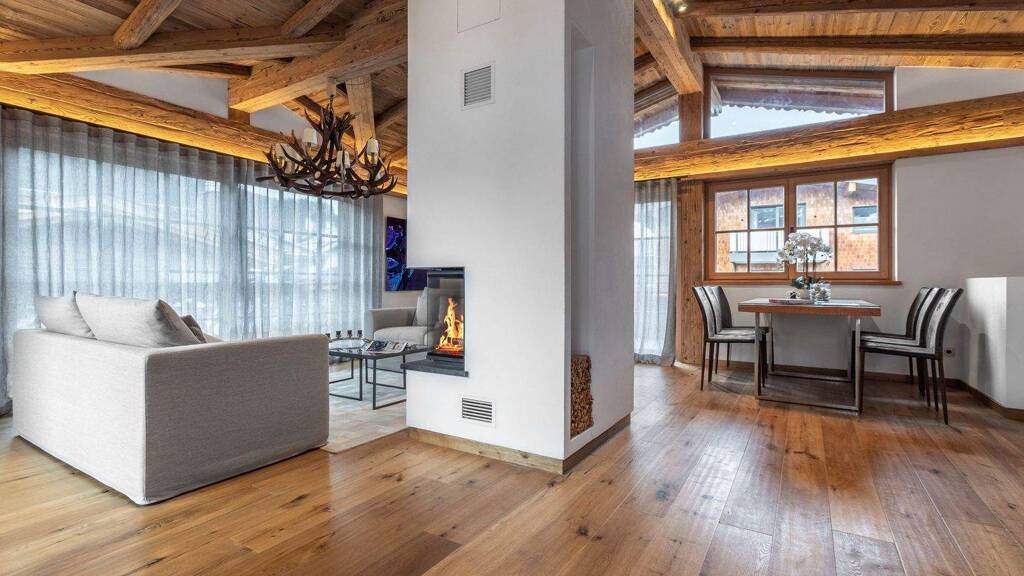 Im Obergeschoss befindet sich der offen gestaltete Wohn- und Essbereich mit offenem Kamin sowie dem eindrucksvollen Sichtdachstuhl aus über 300 Jahre altem Altholz mit antiken Pfetten und Sparren. Die ganzheitliche Verwendung von Altholz, hochwertige Eichenböden und edle Altholztüren prägen das exklusive Ambiente. Von hier aus erschließen sich eine großzügige Terrasse sowie zwei Balkone, die zum gemütlichen Verweilen einladen. Insbesondere im Winter ist der Sonnenuntergang exakt in der Fleckalmsenke zu beobachten, dadurch können auf der Terrasse bis zu 1½ Stunden länger die wärmenden Sonnenstrahlen genossen werden.