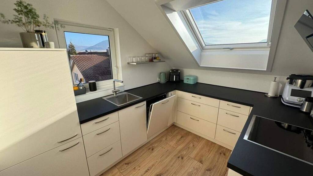 Die hochwertige, neue Einbauküche ist mit modernen Marken-Elektrogeräten ausgestattet und fügt sich harmonisch in das stilvolle Gesamtbild der Wohnung ein. Funktionalität und Design sind hier perfekt aufeinander abgestimmt.