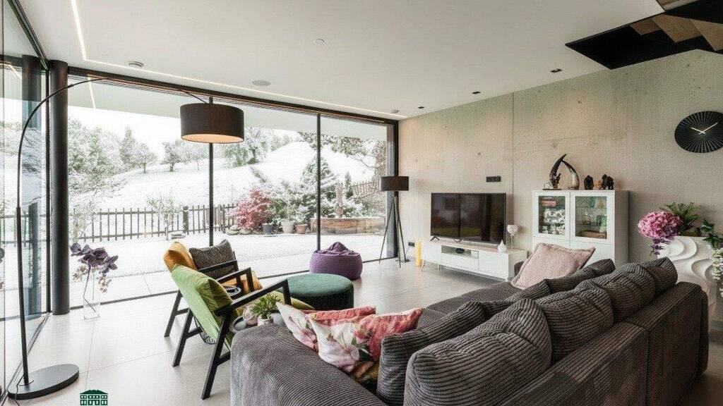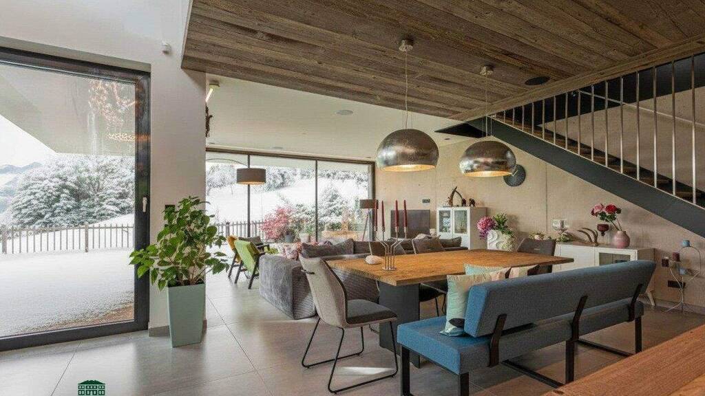 Das Gebäude besticht durch hohe Räume mit sehr großen Glasfronten, die den traumhaften Bergblick auch nach innen holen. Im Erdgeschoß befindet sich der Wohnbereich mit direktem Zugang zum Garten.