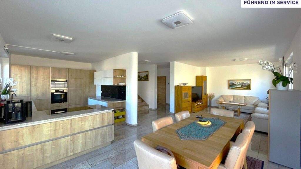 Die neuwertige Küche ist mit hochwertigen Miele-Geräten und einer edlen Granit-Arbeitsplatte ausgestattet.