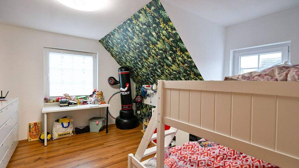 Das Erdgeschoss bietet ein vielseitig nutzbares Wohn- bzw. Schlafzimmer, ein modernes Tageslichtbad mit Walk-In-Dusche sowie eine Küche, die aktuell als Schlafzimmer genutzt wird. Sämtliche Anschlüsse sind weiterhin vorhanden, sodass eine Rücknutzung als Küche sofort möglich ist. Das Highlight ist der pflegeleichte Garten mit überdachter Terrasse, wo Kinder spielen können und bei schönem Wetter gegrillt werden kann. Ein praktischer Abstellraum rundet diese Ebene ab.