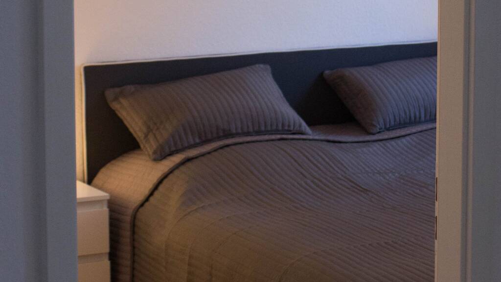 Einen erholsamen Schlaf garantiert das hochwertige Boxspringbett mit Markenbettwaren und Biobettwäsche. Ein geräumiger Kleiderschrank sorgt für genügend Stauraum.
