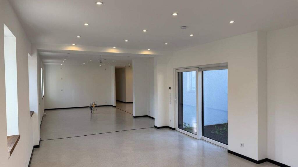 Das Industrie-Design des geschliffenen Sichtestrichbodens steht im spannenden Kontrast zu den weißen Q4-Wänden und den warmtonigen Holzakzenten der Fensterbänke.. Eine Fußbodenheizung mit Einzelraumsteuerung sorgt für angenehme Wärme, eine Klimaanlage für kühle Rückzugsorte im Sommer.