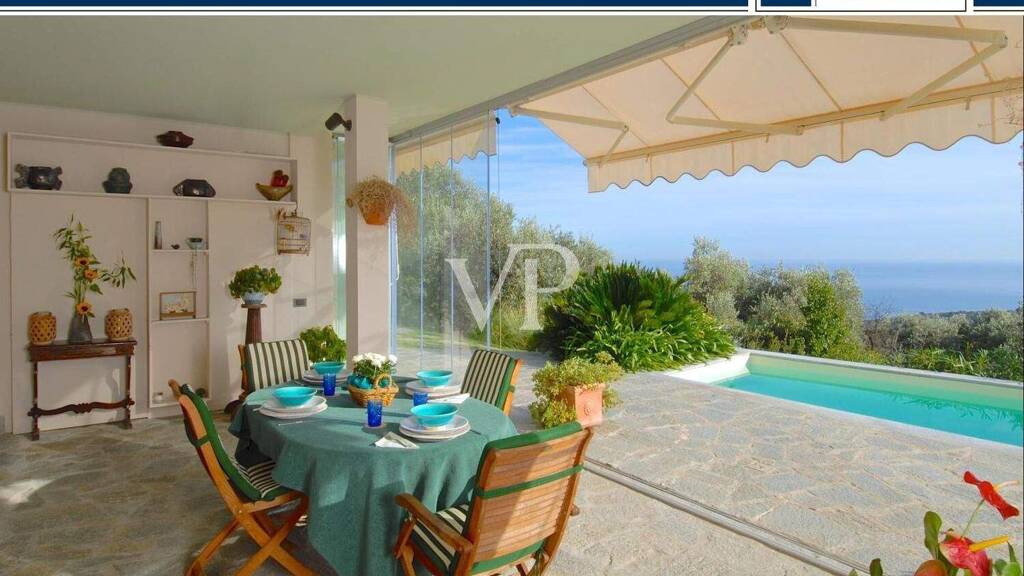 Diese einzigartige Villa steht in einem alten Olivenhain mit atemberaubendem Panoramablick über das Ligurische Meer, das sich vom Golf von Tigullio, Portofino und den Cinque Terre im Osten bis nach Monte Carlo und Nizza im Westen erstreckt.