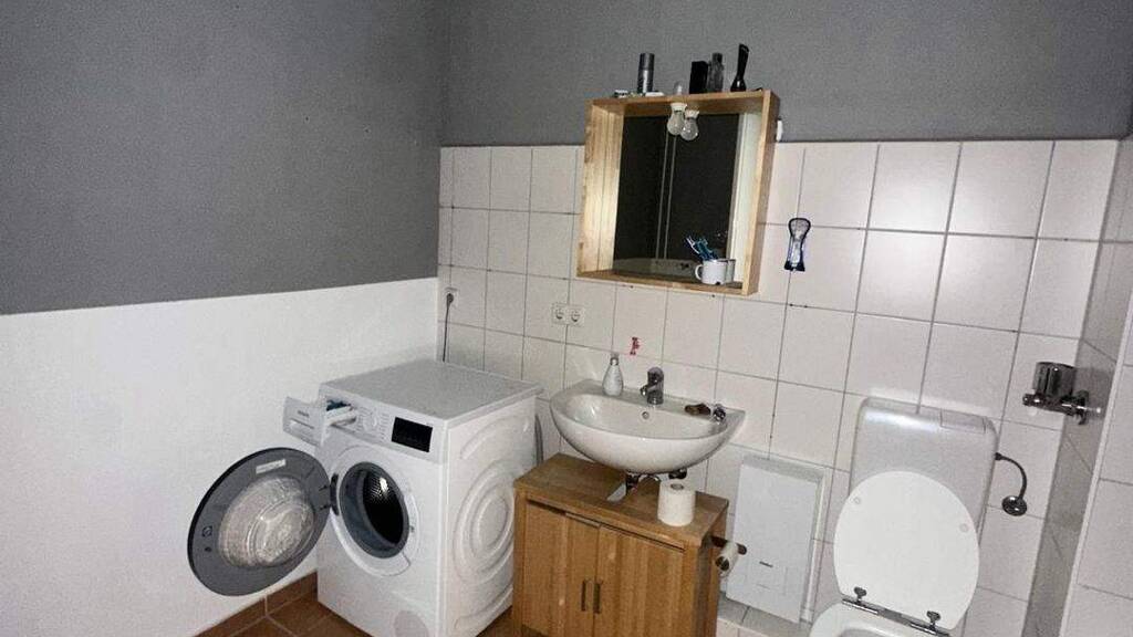 Ein Waschmaschinenanschluss ist im Badezimmer vorhanden.