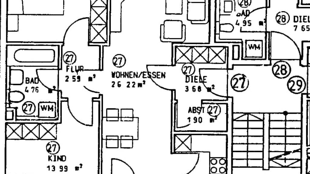 Raumaufteilung Durch den Flur gelangen Sie in den gemütlichen Wohn- und Essbereich. Im Flur finden Sie eine kleine Abstellkammer. An den Wohnbereich angrenzend befinden sich 2 gemütliche Balkone. Vom vorderen Balkon blicken Sie zur Straße während der hintere Balkon einen Blick in den Innenhof bietet. Durch den Wohnbereich gelangen Sie in die Küche und einen kleinen Flur, von welchem aus Sie in den Schlafbereich, das Kinderzimmer und das innenliegende Bad gelangen.
