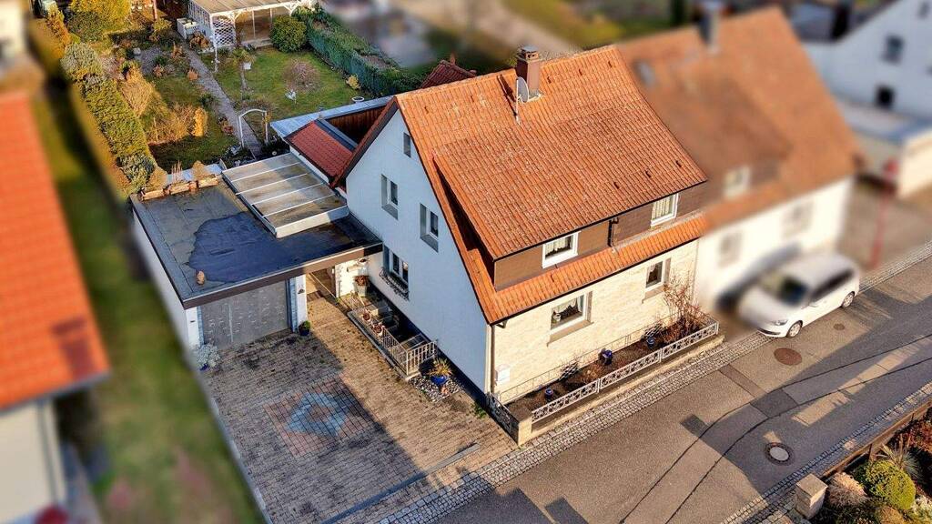 Die Immobilie ist teilweise unterkellert und verfügt über insgesamt 5 Zimmer, darunter 2 Schlafzimmer, 2 Badezimmer sowie ein separates Gäste-WC. Eine ältere Einbauküche ist bereits vorhanden. Vom großen Wohnzimmer mit riesiger Verglasung gelangen Sie auf die teilüberdachte Terrasse, die einen geschützten Bereich für entspannte Stunden im Freien bietet.
