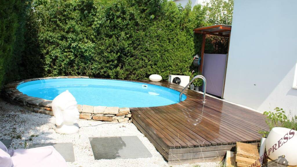 eigene Pool mit Holzdeck schaffen ein besonderes Wohlfühlambiente.