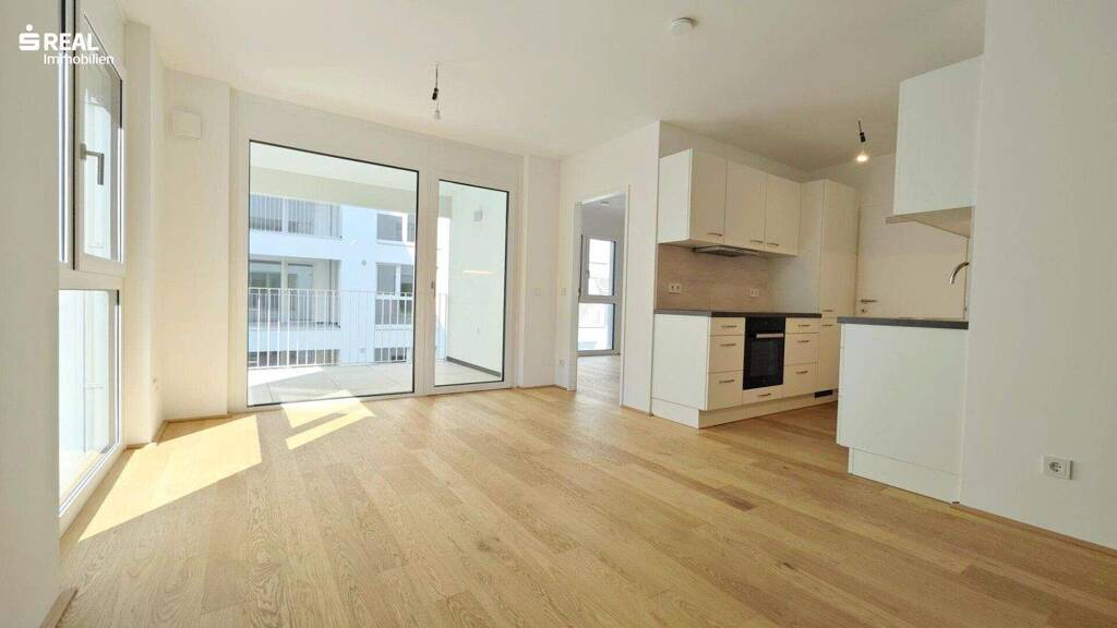* Sonniges Wohnzimmer mit offener Küche und direktem Zugang zum Balkon